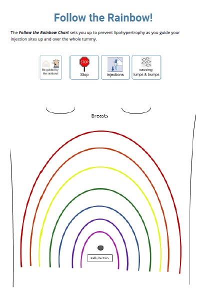 Introducing … The Follow the Rainbow Injection Chart … an innovative education resource and teaching strategy suitable for people with intellectual or cognitive disability or hearing impairment using insulin injections. This is a new approach to an old problem; rotation of injection sites to prevent lipohypertrophy (lumps and bumps).